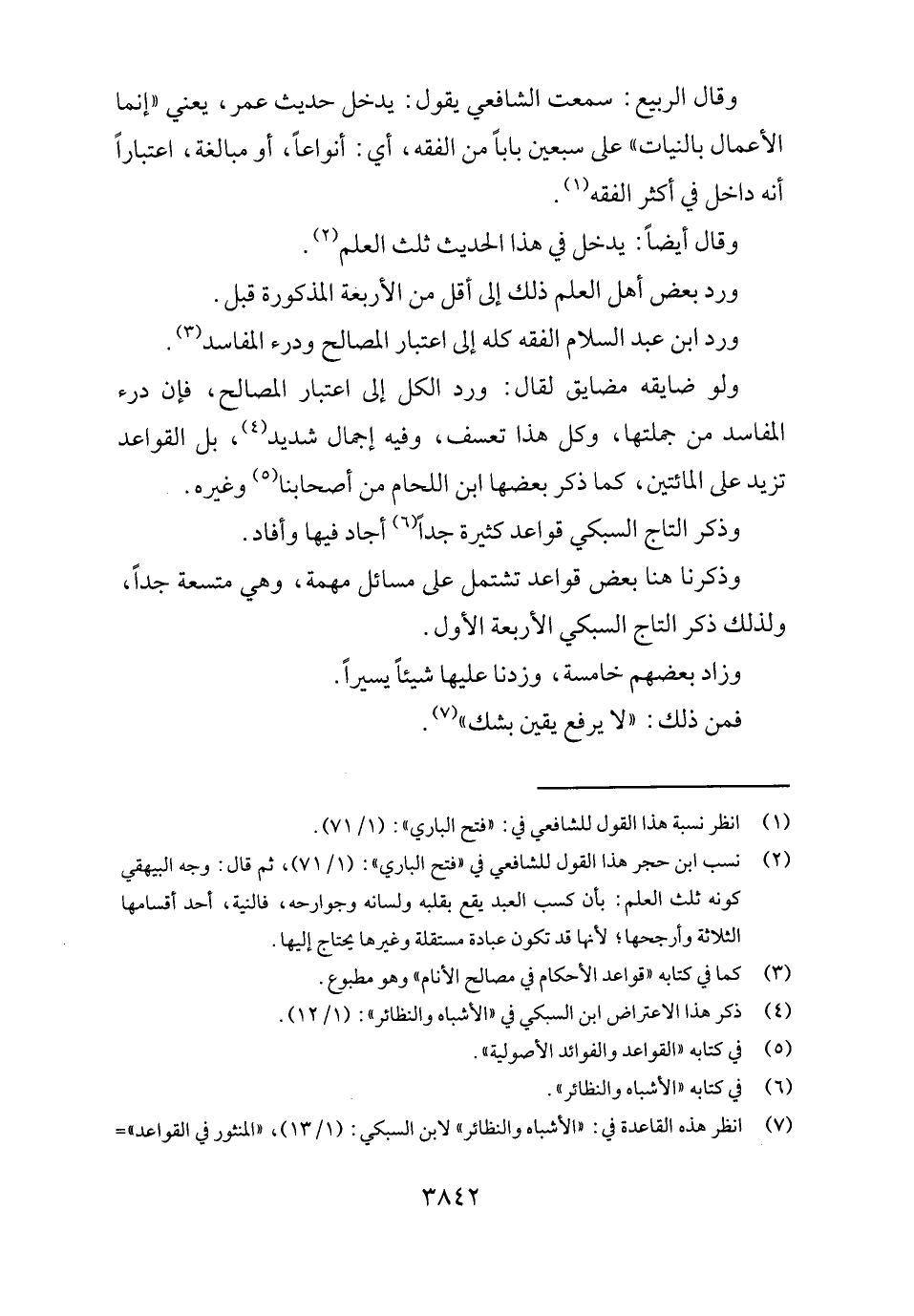 وَقَالَ الرّبيع: سَمِعت الشَّافِعِي يَقُول: يدْخل حَدِيث عمر، يَعْنِي " إِنَّمَا الْأَعْمَال بِالنِّيَّاتِ " على سبعين بَابا من الْفِقْه، أَي: أنواعا، أَو مُبَالغَة، اعْتِبَارا أَنه دَاخل فِي أَكثر الْفِقْه.