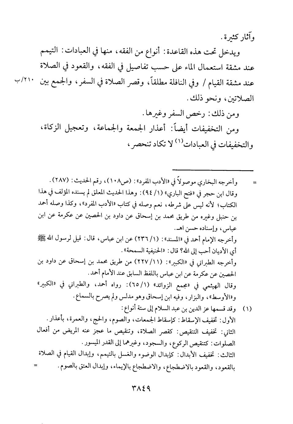 وَمن التخفيفات أَيْضا: أعذار الْجُمُعَة وَالْجَمَاعَة، وتعجيل الزَّكَاة، والتخفيفات فِي الْعِبَادَات لَا تكَاد تَنْحَصِر،
