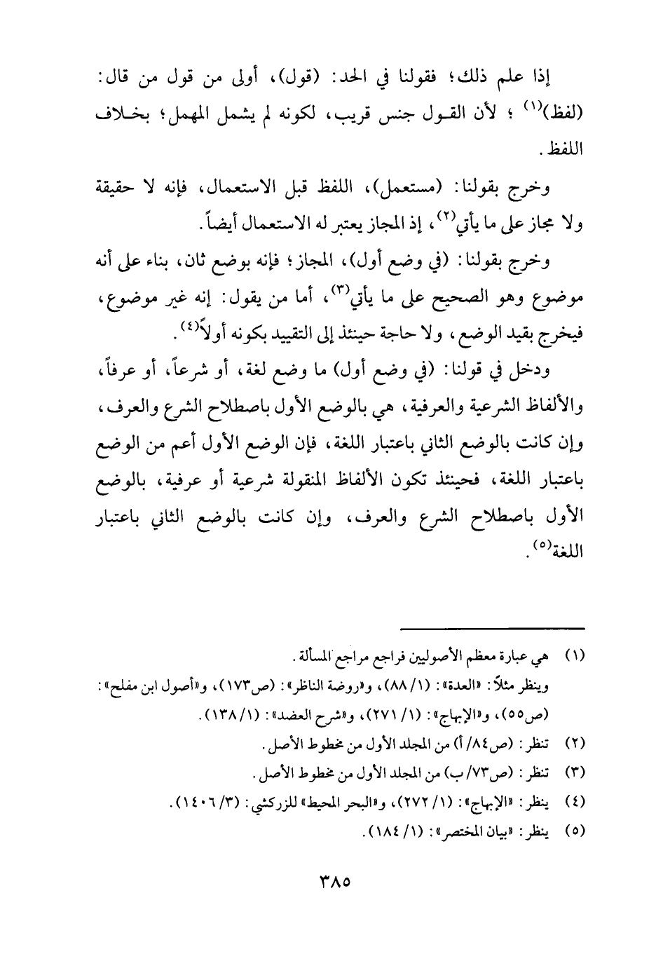 إِذا علم ذَلِك؛ فقولنا فِي الْحَد: (قَول) ، أولى من قَول من قَالَ: (لفظ) ؛ لِأَن القَوْل جنس قريب، لكَونه لم يَشْمَل المهمل؛ بِخِلَاف اللَّفْظ.