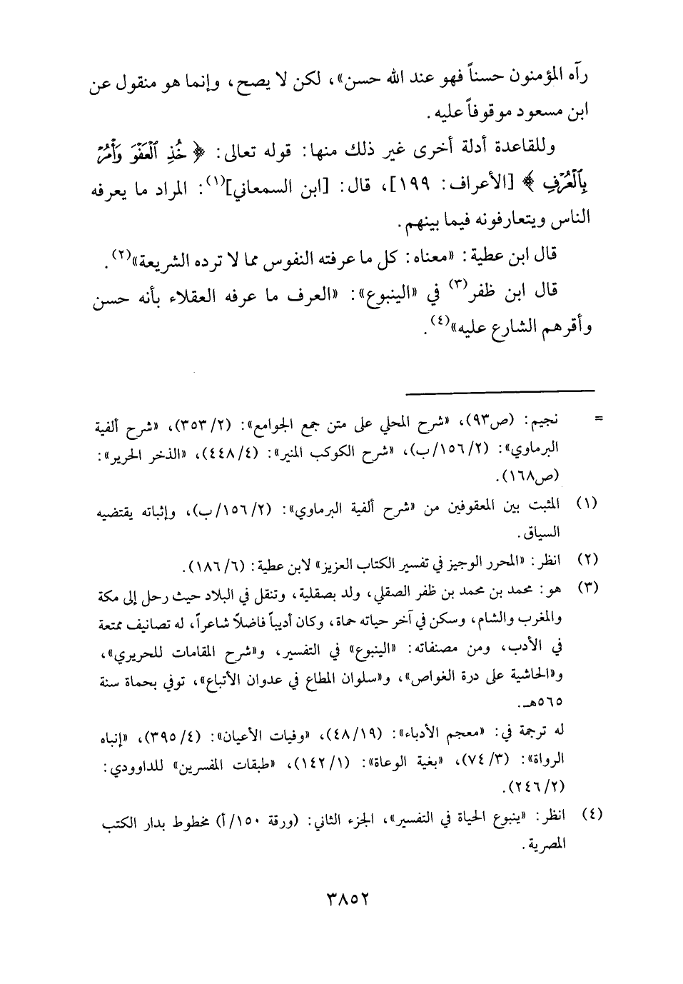 قَالَ ابْن ظفر فِي " الينبوع ": " الْعرف مَا عرفه الْعُقَلَاء بِأَنَّهُ حسن وأقرهم الشَّارِع عَلَيْهِ ".