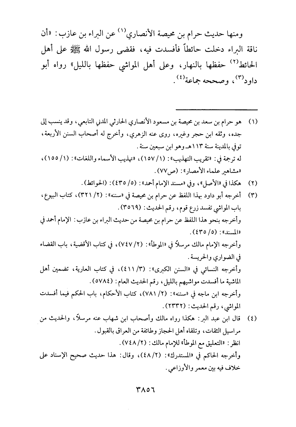 وَمِنْهَا حَدِيث حرَام بن محيصة الْأنْصَارِيّ عَن الْبَراء بن عَازِب: " أَن نَاقَة الْبَراء دخلت حَائِطا فأفسدت فِيهِ، فَقضى رَسُول الله - صَلَّى اللَّهُ عَلَيْهِ وَسَلَّم َ - على أهل الْحَائِط حفظهَا بِالنَّهَارِ، وعَلى أهل الْمَوَاشِي حفظهَا بِاللَّيْلِ " رَوَاهُ أَبُو دَاوُد، وَصَححهُ جمَاعَة.