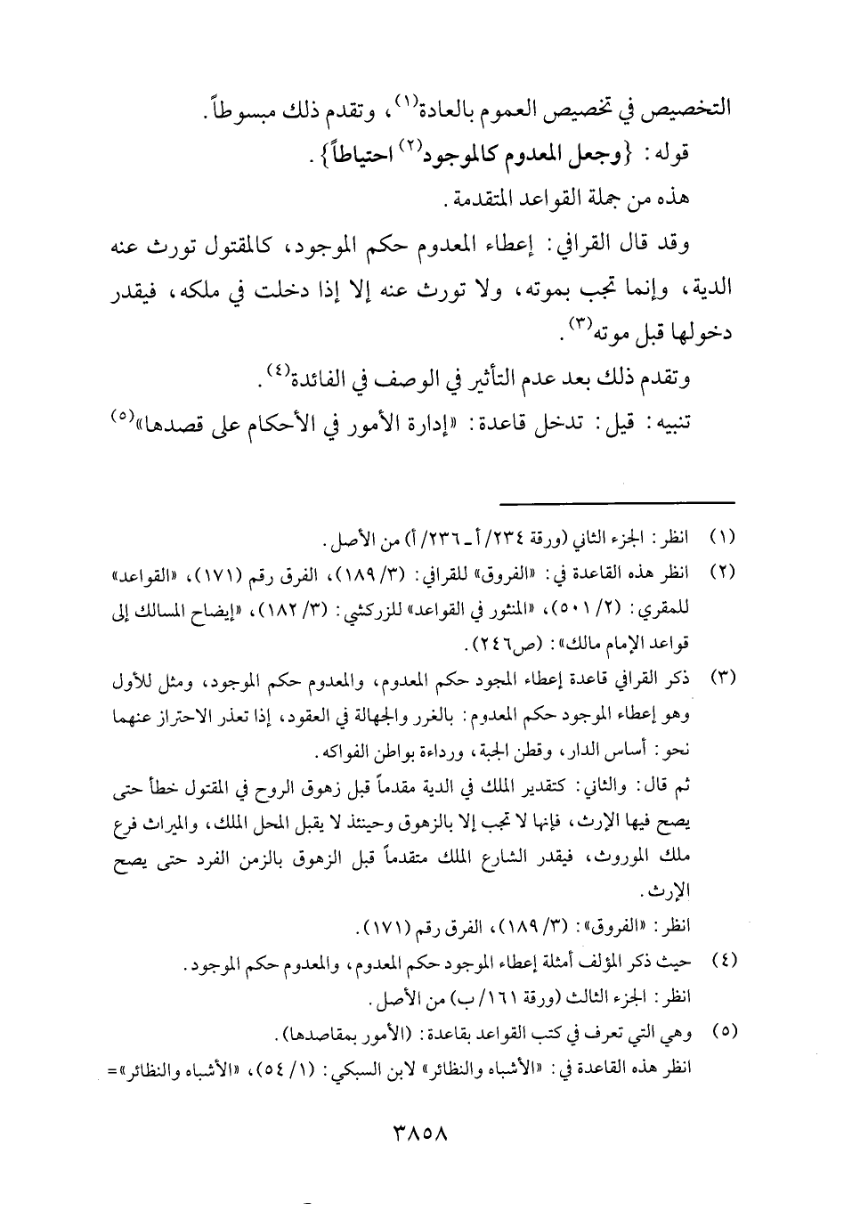 وَقد قَالَ الْقَرَافِيّ: إِعْطَاء الْمَعْدُوم حكم الْمَوْجُود، كالمقتول تورث عَنهُ الدِّيَة، وَإِنَّمَا تجب بِمَوْتِهِ، وَلَا تورث عَنهُ إِلَّا إِذا دخلت فِي ملكه، فَيقدر دُخُولهَا قبل مَوته.