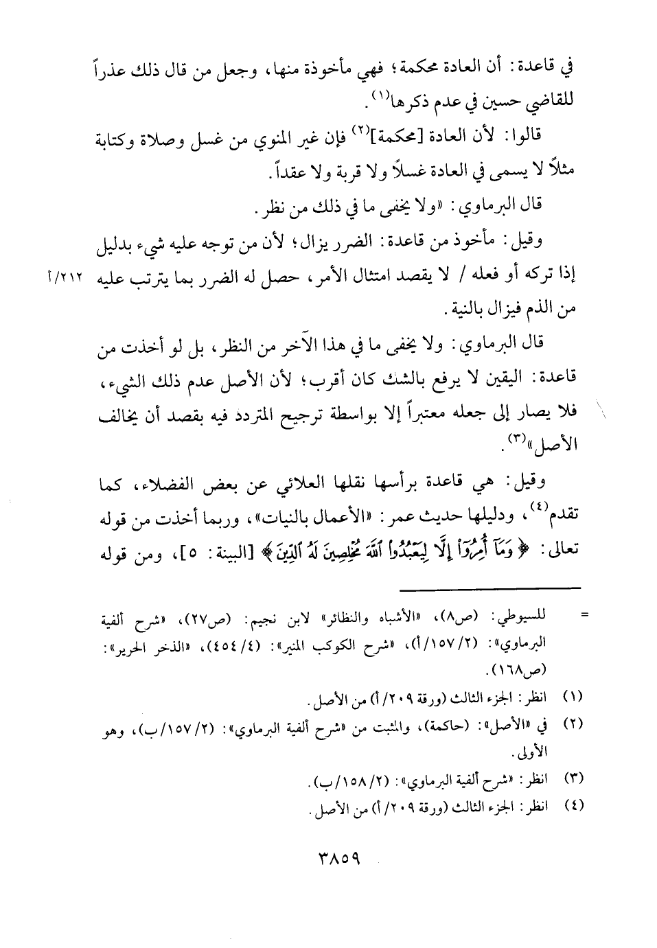 قَالَ الْبرمَاوِيّ: وَلَا يخفى مَا فِي هَذَا الآخر من النّظر، بل لَو أخذت من قَاعِدَة: الْيَقِين لَا يرفع بِالشَّكِّ كَانَ أقرب؛ لِأَن الأَصْل عدم ذَلِك الشَّيْء، فَلَا يُصَار إِلَى جعله مُعْتَبرا إِلَّا بِوَاسِطَة تَرْجِيح المتردد فِيهِ بِقصد أَن يُخَالف الأَصْل ".