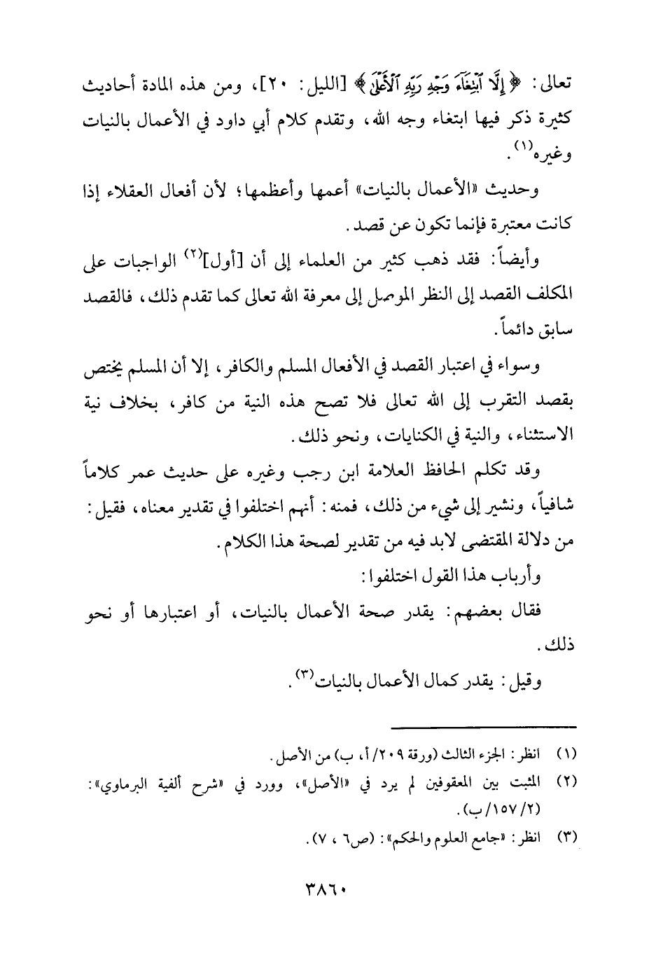 تَعَالَى: {إِلَّا ابْتِغَاء وَجه ربه الْأَعْلَى} [اللَّيْل: ٢٠] ، وَمن هَذِه الْمَادَّة أَحَادِيث كَثِيرَة ذكر فِيهَا ابْتِغَاء وَجه الله، وَتقدم كَلَام أبي دَاوُد فِي الْأَعْمَال بِالنِّيَّاتِ وَغَيره.