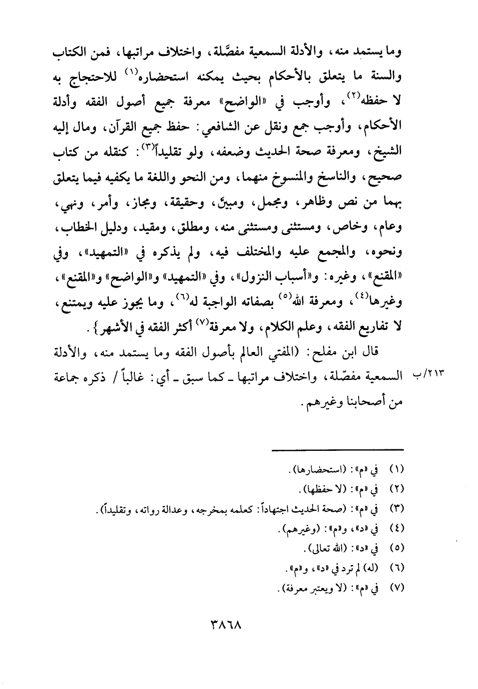 قَالَ ابْن مُفْلِح: (الْمُفْتِي الْعَالم بأصول الْفِقْه وَمَا يستمد مِنْهُ، والأدلة السمعية مفصلة، وَاخْتِلَاف مراتبها - كَمَا سبق - أَي: غَالِبا ذكره جمَاعَة من أَصْحَابنَا وَغَيرهم.