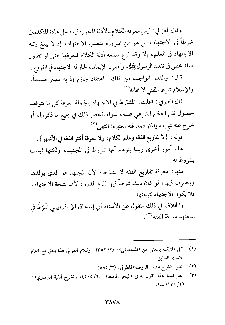قَالَ الطوفي: " قلت: الْمُشْتَرط فِي الِاجْتِهَاد بِالْجُمْلَةِ معرفَة كل مَا يتَوَقَّف حُصُول ظن الحكم الشَّرْعِيّ عَلَيْهِ، سَوَاء انحصر ذَلِك فِي جَمِيع مَا ذكرُوا، أَو خرج عَنهُ شَيْء لم يذكر فمعرفته مُعْتَبرَة " انْتهى.