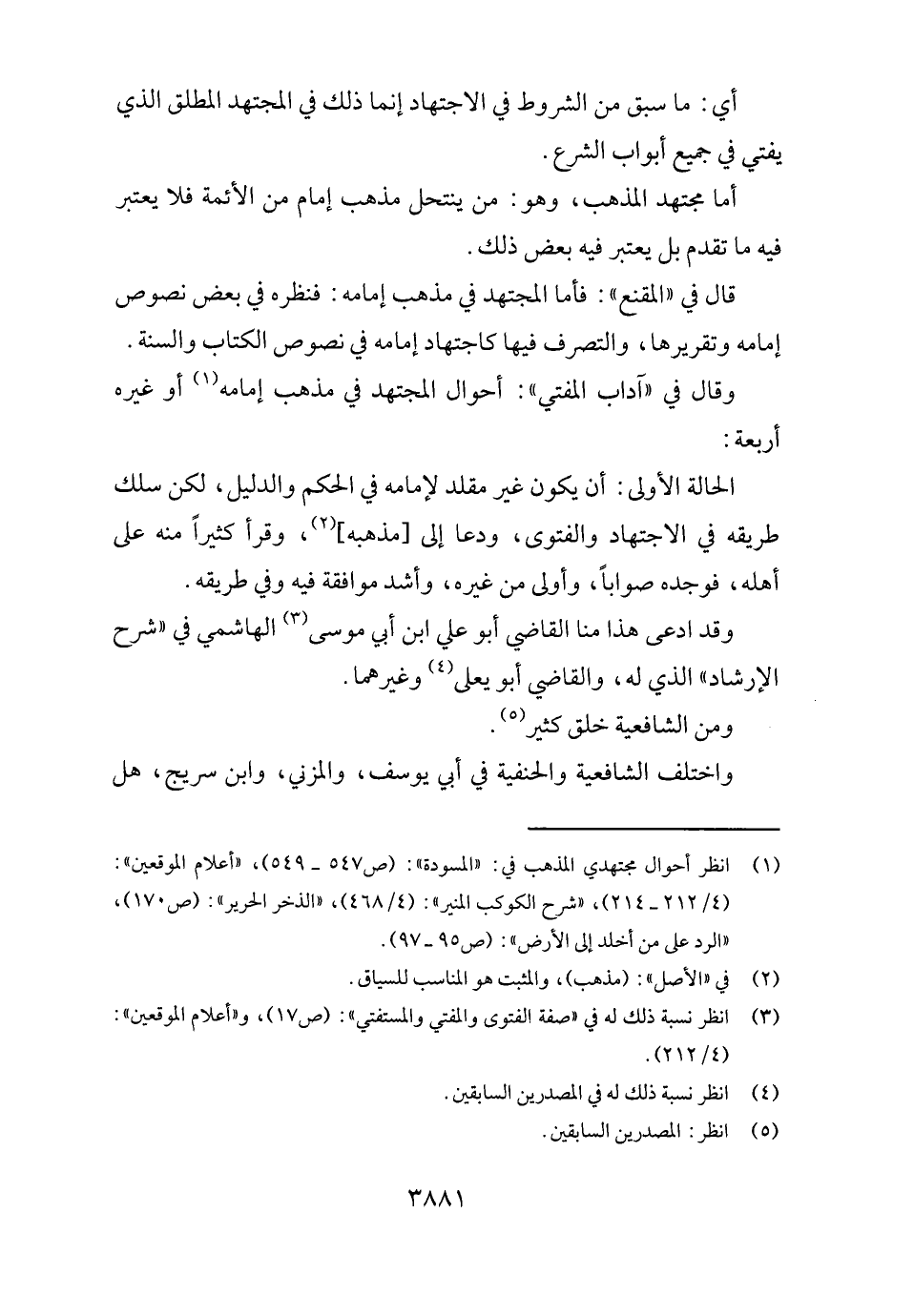 أما مُجْتَهد الْمَذْهَب، وَهُوَ: من ينتحل مَذْهَب إِمَام من الْأَئِمَّة فَلَا يعْتَبر فِيهِ مَا تقدم بل يعْتَبر فِيهِ بعض ذَلِك.