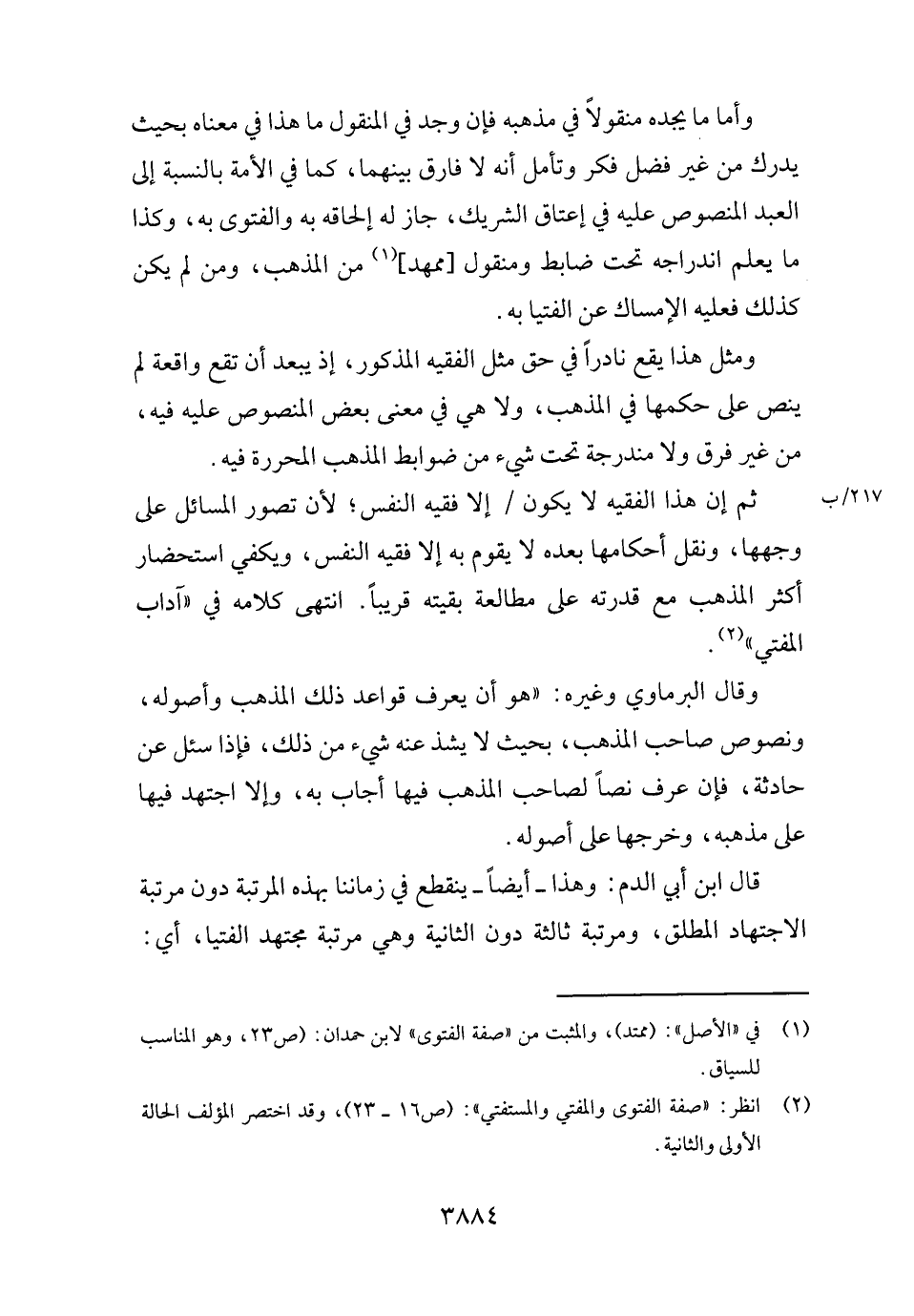 ثمَّ إِن هَذَا الْفَقِيه لَا يكون إِلَّا فَقِيه النَّفس؛ لِأَن تصور الْمسَائِل على وَجههَا، وَنقل أَحْكَامهَا بعده لَا يقوم بِهِ إِلَّا فَقِيه النَّفس، وَيَكْفِي استحضار أَكثر الْمَذْهَب مَعَ قدرته على مطالعة بَقِيَّته قَرِيبا. انْتهى كَلَامه فِي " آدَاب الْمُفْتِي ".