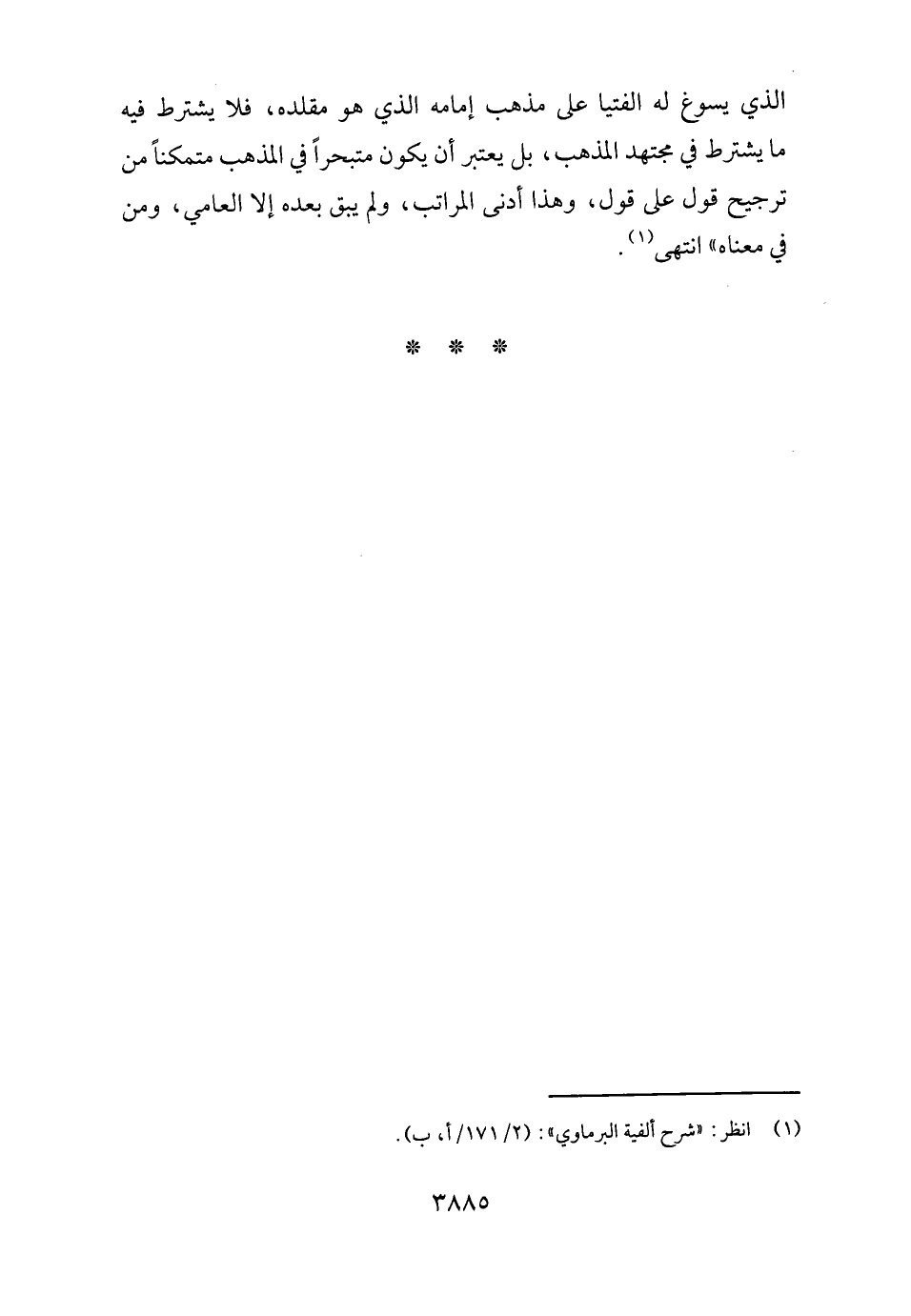 الَّذِي يسوغ لَهُ الْفتيا على مَذْهَب إِمَامه الَّذِي هُوَ مقلده، فَلَا يشْتَرط فِيهِ مَا يشْتَرط فِي مُجْتَهد الْمَذْهَب، بل يعْتَبر أَن يكون متبحرا فِي الْمَذْهَب مُتَمَكنًا من تَرْجِيح قَول على قَول، وَهَذَا أدنى الْمَرَاتِب، وَلم يبْق بعده إِلَّا الْعَاميّ، وَمن فِي مَعْنَاهُ " انْتهى.