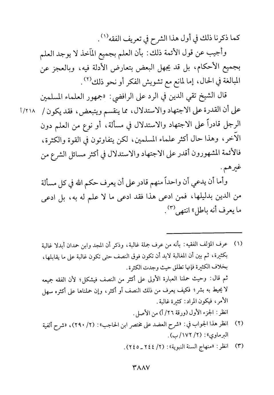 قَالَ الشَّيْخ تَقِيّ الدّين فِي الرَّد على الرافضي: " جُمْهُور الْعلمَاء الْمُسلمين على أَن الْقُدْرَة على الِاجْتِهَاد وَالِاسْتِدْلَال، مِمَّا يَنْقَسِم ويتبعض، فقد يكون الرجل قَادِرًا على الِاجْتِهَاد وَالِاسْتِدْلَال فِي مَسْأَلَة، أَو نوع من الْعلم دون الآخر، وَهَذَا حَال أَكثر عُلَمَاء الْمُسلمين، لَكِن يتفاوتون فِي الْقُوَّة وَالْكَثْرَة، فالأئمة المشهورون أقدر على الِاجْتِهَاد وَالِاسْتِدْلَال فِي أَكثر مسَائِل الشَّرْع من غَيرهم.