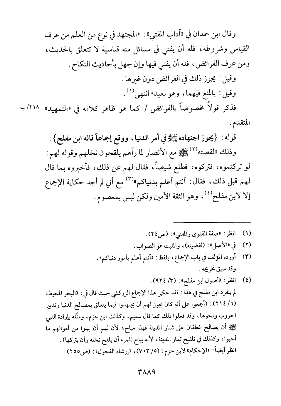 وَذَلِكَ " لقصته - صَلَّى اللَّهُ عَلَيْهِ وَسَلَّم َ - مَعَ الْأَنْصَار لما رَآهُمْ يُلَقِّحُونَ نَخْلهمْ وَقَوله لَهُم: لَو تَرَكْتُمُوهُ، فَتَرَكُوهُ، فطلع شيصا، فَقَالَ لَهُم عَن ذَلِك، فأخبروه بِمَا قَالَ لَهُم قبل ذَلِك، فَقَالَ: أَنْتُم أعلم بدنياكم مَعَ أَنِّي لم أجد حِكَايَة الْإِجْمَاع إِلَّا لِابْنِ مُفْلِح، وَهُوَ الثِّقَة الْأمين وَلَكِن لَيْسَ بمعصوم.