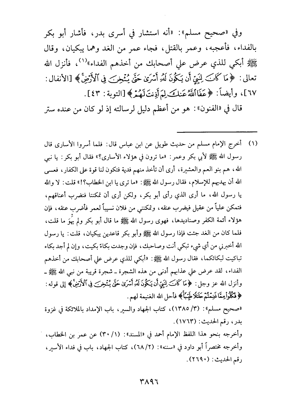 وَفِي " صَحِيح مُسلم ": " أَنه اسْتَشَارَ فِي أسرى بدر، فَأَشَارَ أَبُو بكر بِالْفِدَاءِ، فأعجبه، وَعمر بِالْقَتْلِ، فجَاء عمر من الْغَد وهما يَبْكِيَانِ، وَقَالَ - صَلَّى اللَّهُ عَلَيْهِ وَسَلَّم َ - أبْكِي للَّذي عرض عَليّ أَصْحَابك من أَخذهم الْفِدَاء "، فَأنْزل الله تَعَالَى: {مَا كَانَ لنَبِيّ أَن يكون لَهُ أسرى حَتَّى يثخن فِي الأَرْض} [الْأَنْفَال: ٦٧] ، وَأَيْضًا: {عَفا الله عَنْك لم أَذِنت لَهُم} [التَّوْبَة: ٤٣] .