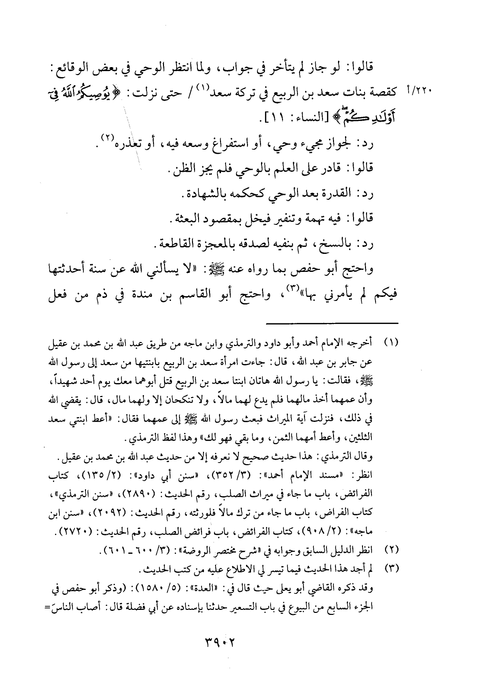 قَالُوا: لَو جَازَ لم يتَأَخَّر فِي جَوَاب، وَلما انْتظر الْوَحْي فِي بعض الوقائع: كقصة بَنَات سعد بن الرّبيع فِي تَرِكَة سعد حَتَّى نزلت: {يُوصِيكُم الله فِي أَوْلَادكُم} [النِّسَاء: ١١] .