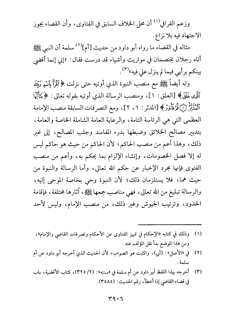 وَله أَيْضا - صَلَّى اللَّهُ عَلَيْهِ وَسَلَّم َ - مَعَ منصب النُّبُوَّة الَّذِي أوتيه حَتَّى نزلت {اقْرَأ باسم رَبك الَّذِي خلق} [العلق: ١] ، ومنصب الرسَالَة الَّذِي أوتيه بقوله تَعَالَى: {يَا أَيهَا المدثر (١) قُم فَأَنْذر} [المدثر ١، ٢] ، وَمَعَ التَّصَرُّفَات السَّابِقَة منصب الْإِمَامَة الْعُظْمَى الَّتِي هِيَ الرِّئَاسَة التَّامَّة، وَالرِّعَايَة الْعَامَّة الشاملة الْخَاصَّة والعامة، بتدبير مصَالح الْخَلَائق وضبطها بدرء الْمَفَاسِد وجلب الْمصَالح، إِلَى غير ذَلِك، وَهَذَا أَعم من منصب الْحَاكِم؛ لِأَن الْحَاكِم من حَيْثُ هُوَ حَاكم لَيْسَ لَهُ إِلَّا فصل الْخُصُومَات، وإنشاء الْإِلْزَام بِمَا يحكم بِهِ، وأعم من منصب الْفَتْوَى فَإِنَّهَا مُجَرّد الْإِخْبَار عَن حكم الله تَعَالَى، وَأما الرسَالَة والنبوة من حَيْثُ هما، فَلَا يستلزمان ذَلِك؛ لِأَن النُّبُوَّة وَحي بِخَاصَّة الموحى إِلَيْهِ، والرسالة تَبْلِيغ من الله تَعَالَى، فَهِيَ مناصب جمعهَا - صَلَّى اللَّهُ عَلَيْهِ وَسَلَّم َ -، آثارها مُخْتَلفَة، فإقامة الْحُدُود، وترتيب الجيوش وَغير ذَلِك، من منصب الإِمَام، وَلَيْسَ لأحد