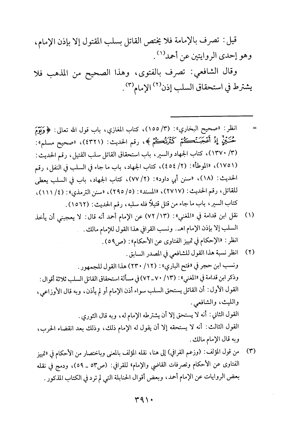 وَقَالَ الشَّافِعِي: تصرف بالفتوى، وَهَذَا الصَّحِيح من الْمَذْهَب فَلَا يشْتَرط فِي اسْتِحْقَاق السَّلب إِذن الإِمَام.