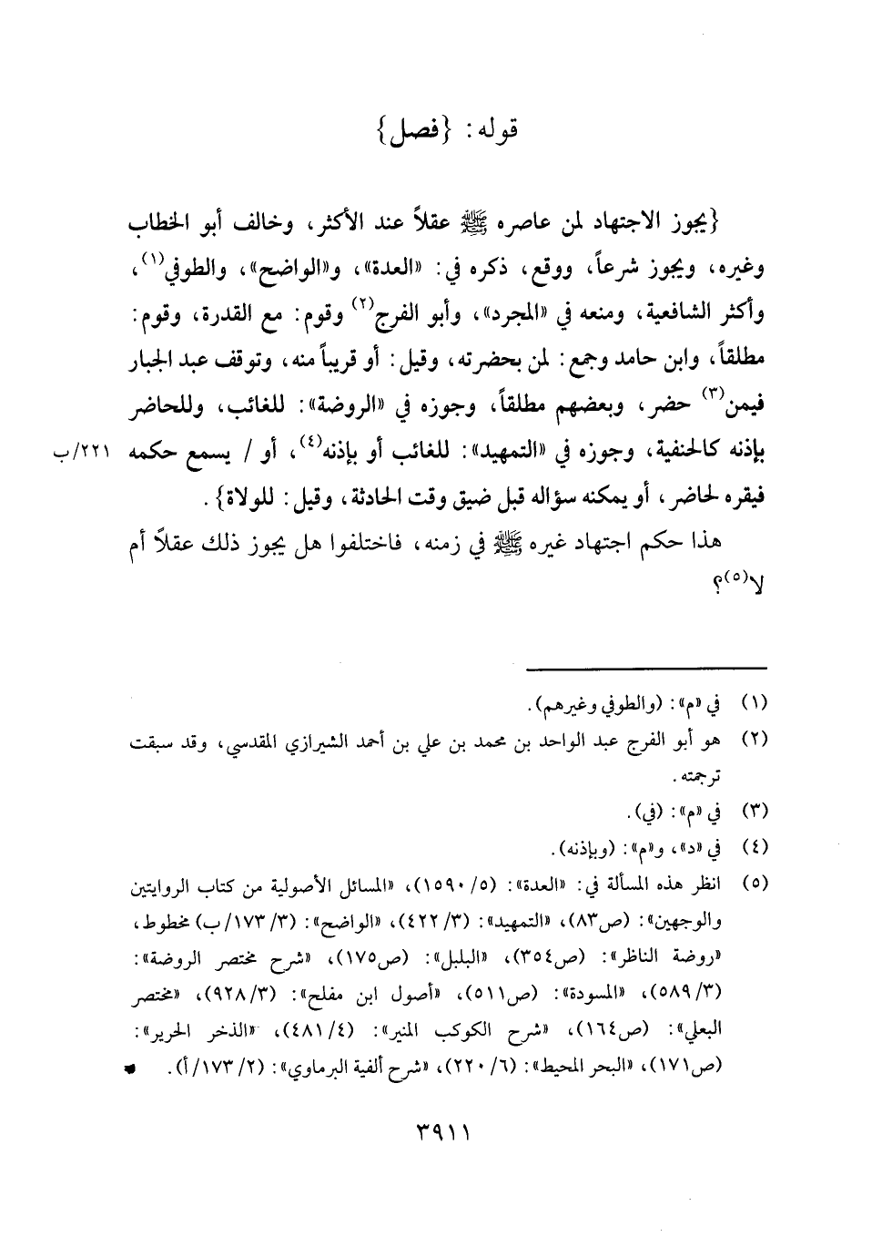 {يجوز الِاجْتِهَاد لمن عاصره - صَلَّى اللَّهُ عَلَيْهِ وَسَلَّم َ - عقلا عِنْد الْأَكْثَر، وَخَالف أَبُو الْخطاب وَغَيره، وَيجوز شرعا، وَوَقع، ذكره فِي: " الْعدة "، و " الْوَاضِح "، والطوفي، وَأكْثر الشَّافِعِيَّة، وَمنعه فِي " الْمُجَرّد "، وَأَبُو الْفرج وَقوم: مَعَ الْقُدْرَة، وَقوم: مُطلقًا، وَابْن حَامِد وَجمع: لمن بِحَضْرَتِهِ، وَقيل: أَو قَرِيبا مِنْهُ، وَتوقف عبد الْجَبَّار فِيمَن حضر، وَبَعْضهمْ مُطلقًا، وَجوزهُ فِي " الرَّوْضَة ": للْغَائِب، وللحاضر بِإِذْنِهِ كالحنفية، وَجوزهُ فِي " التَّمْهِيد ": للْغَائِب أَو بِإِذْنِهِ، أَو يسمع حكمه فيقره لحاضر، أَو يُمكنهُ سُؤَاله قبل ضيق وَقت الْحَادِثَة، وَقيل: للولاة} .