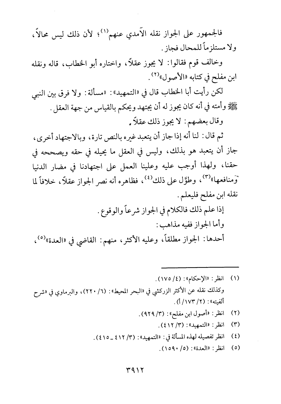 ثمَّ قَالَ: لنا أَنه إِذا جَازَ أَن يتعبد غَيره بِالنَّصِّ تَارَة، وبالاجتهاد أُخْرَى، جَازَ أَن يتعبد هُوَ بذلك، وَلَيْسَ فِي الْعقل مَا يحيله فِي حَقه ويصححه فِي حَقنا، وَلِهَذَا أوجب عَلَيْهِ وعلينا الْعَمَل على اجتهادنا فِي مضار الدُّنْيَا ومنافعها "، وَطول على ذَلِك، فَظَاهره أَنه نصر الْجَوَاز عقلا، خلافًا لما نَقله ابْن مُفْلِح فَليعلم.