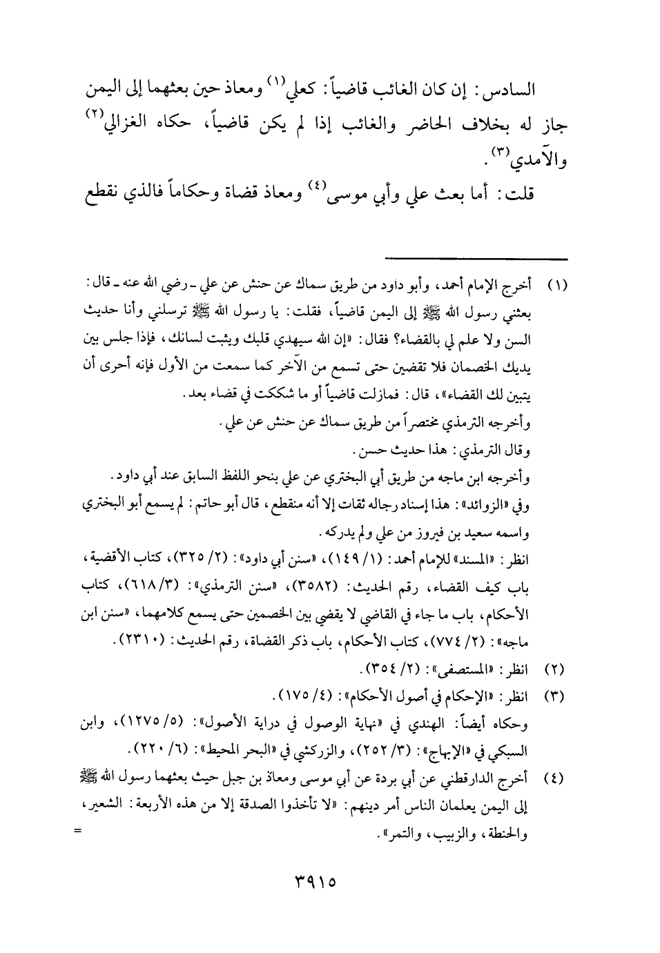السَّادِس: إِن كَانَ الْغَائِب قَاضِيا: كعلي ومعاذ حِين بعثهما إِلَى الْيمن جَازَ لَهُ بِخِلَاف الْحَاضِر وَالْغَائِب إِذا لم يكن قَاضِيا، حَكَاهُ الْغَزالِيّ والآمدي.