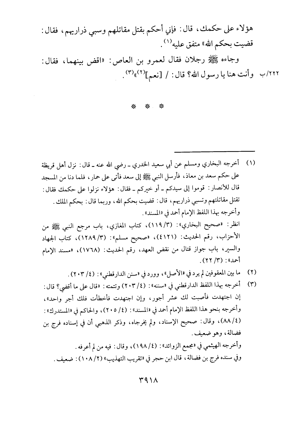 وجاءه - صَلَّى اللَّهُ عَلَيْهِ وَسَلَّم َ - رجلَانِ فَقَالَ لعَمْرو بن الْعَاصِ: " اقْضِ بَينهمَا، فَقَالَ: وَأَنت هُنَا يَا رَسُول الله؟ قَالَ: [نعم] ".