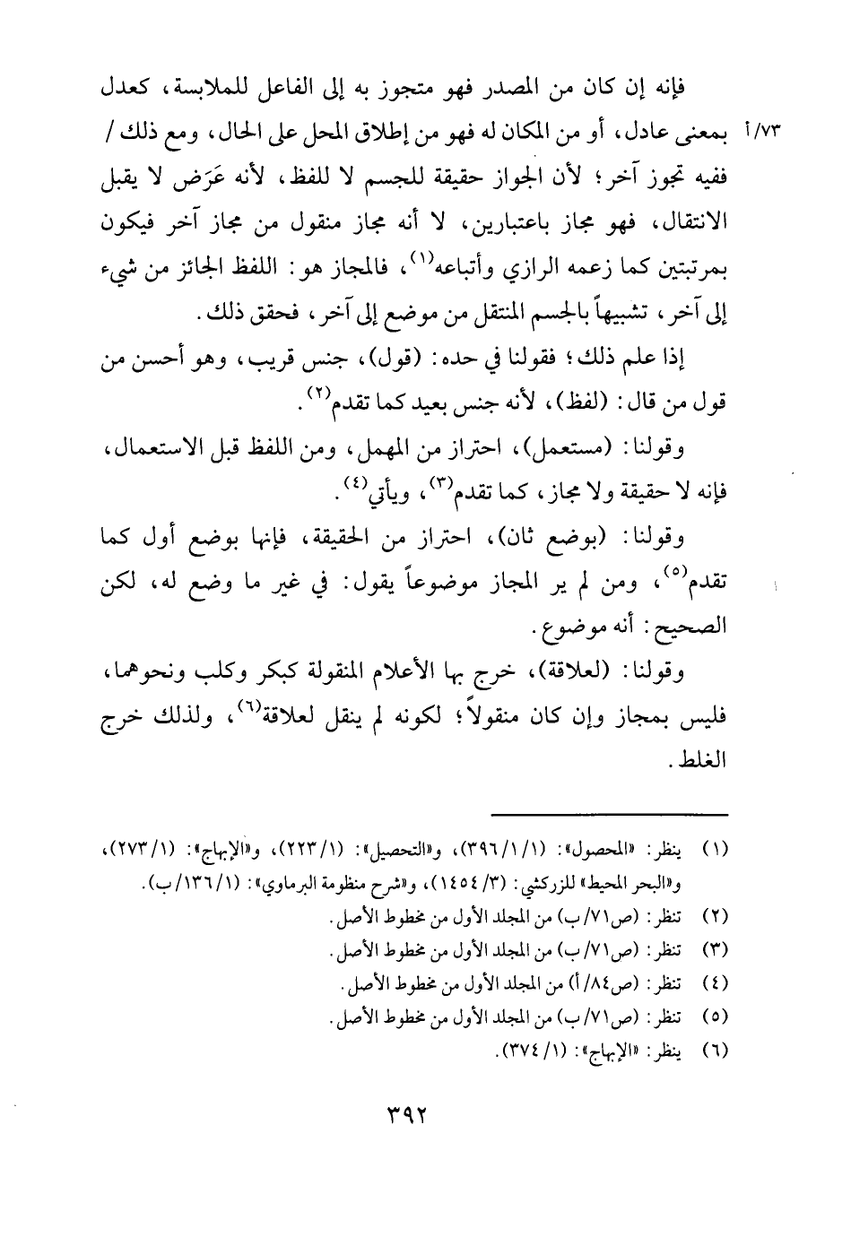 فَإِنَّهُ إِن كَانَ من الْمصدر فَهُوَ متجوز بِهِ إِلَى الْفَاعِل للملابسة، كَعدْل بِمَعْنى عَادل، أَو من الْمَكَان لَهُ فَهُوَ من إِطْلَاق الْمحل على الْحَال، وَمَعَ ذَلِك / فَفِيهِ تجوز آخر؛ لِأَن الْجَوَاز حَقِيقَة للجسم لَا للفظ، لِأَنَّهُ عرض لَا يقبل الِانْتِقَال، فَهُوَ مجَاز باعتبارين، لَا أَنه مجَاز مَنْقُول من مجَاز آخر فَيكون بمرتبتين كَمَا زَعمه الرَّازِيّ وَأَتْبَاعه، فالمجاز هُوَ: اللَّفْظ الْجَائِز من شَيْء إِلَى آخر، تَشْبِيها بالجسم الْمُنْتَقل من مَوضِع إِلَى آخر، فحقق ذَلِك.