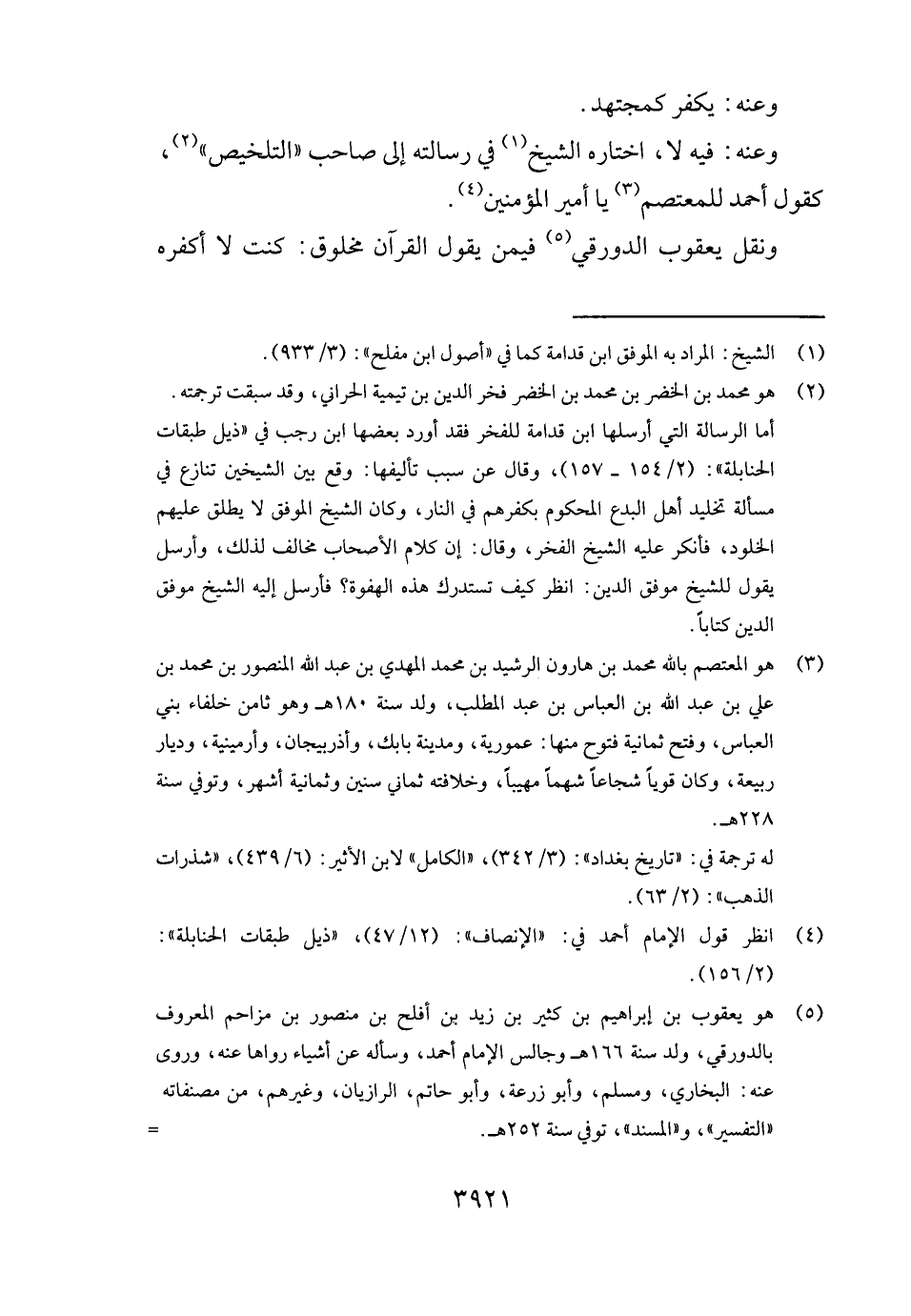 وَنقل يَعْقُوب الدَّوْرَقِي فِيمَن يَقُول الْقُرْآن مَخْلُوق: كنت لَا أكفره