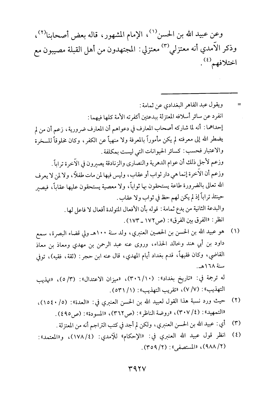 وَعَن عبيد الله بن الْحسن، الإِمَام الْمَشْهُور، قَالَه بعض أَصْحَابنَا، وَذكر الْآمِدِيّ أَنه معتزلي معتزلي: المجتهدون من أهل الْقبْلَة مصيبون مَعَ اخْتلَافهمْ.