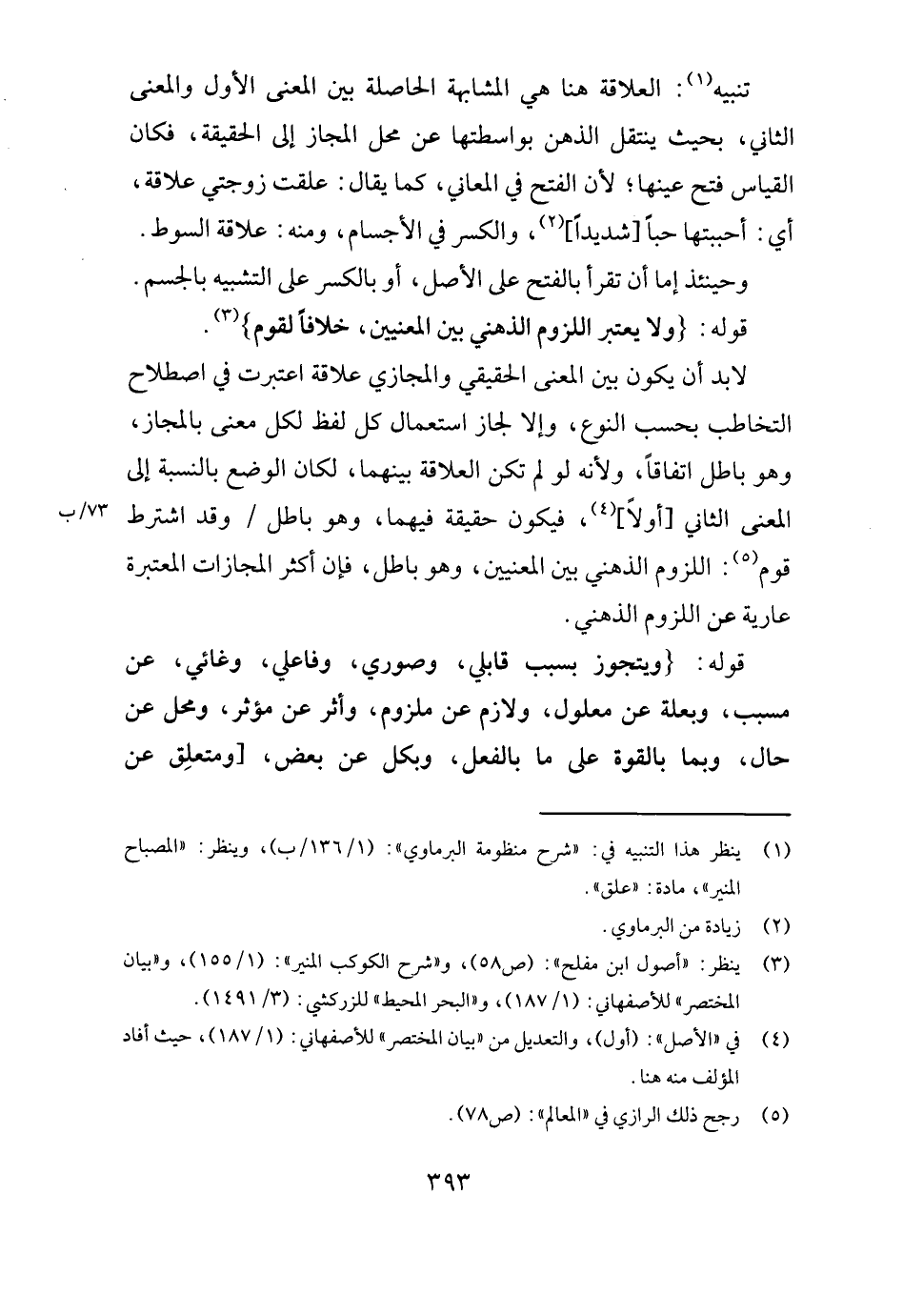 تَنْبِيه: العلاقة هُنَا هِيَ المشابهة الْحَاصِلَة بَين الْمَعْنى الأول وَالْمعْنَى الثَّانِي، بِحَيْثُ ينْتَقل الذِّهْن بواسطتها عَن مَحل الْمجَاز إِلَى الْحَقِيقَة، فَكَانَ الْقيَاس فتح عينهَا؛ لِأَن الْفَتْح فِي الْمعَانِي، كَمَا يُقَال: علقت زَوْجَتي علاقَة، أَي: أحببتها حبا [شَدِيدا] ، وَالْكَسْر فِي الْأَجْسَام، وَمِنْه: علاقَة السَّوْط.
