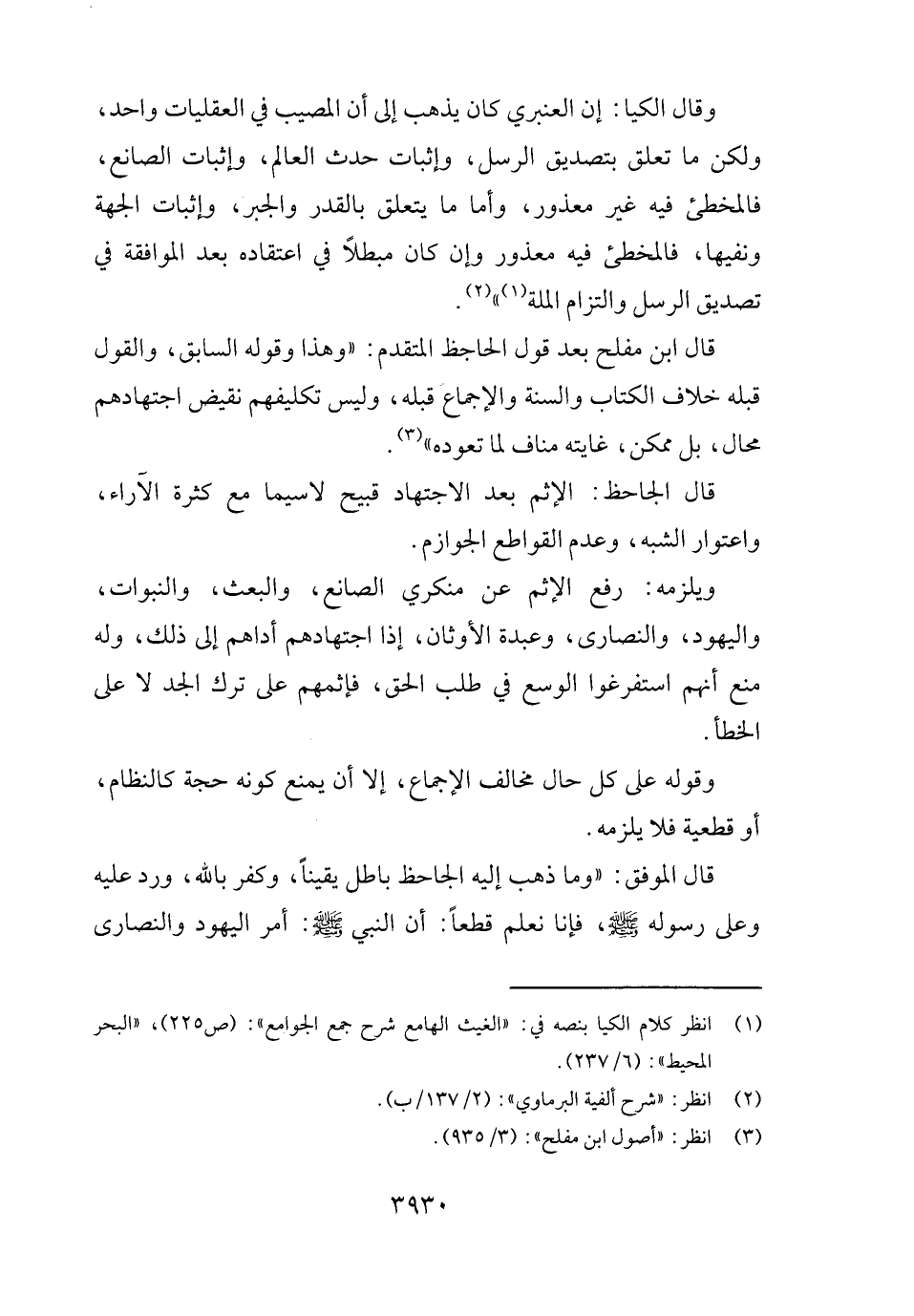 قَالَ ابْن مُفْلِح بعد قَول الجاحظ الْمُتَقَدّم: " وَهَذَا وَقَوله السَّابِق، وَالْقَوْل قبله خلاف الْكتاب وَالسّنة وَالْإِجْمَاع قبله، وَلَيْسَ تكليفهم نقيض اجتهادهم محَال، بل مُمكن، غَايَته منَاف لما تعوده ".