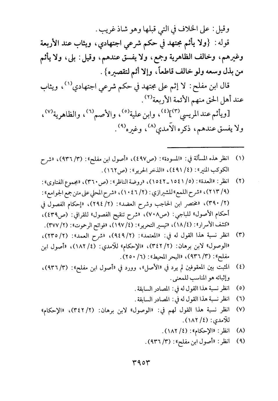 [وَيَأْثَم عِنْد المريسي] ، وَابْن علية، والأصم، والظاهرية، وَلَا يفسق عِنْدهم، ذكره الْآمِدِيّ، وَغَيره.