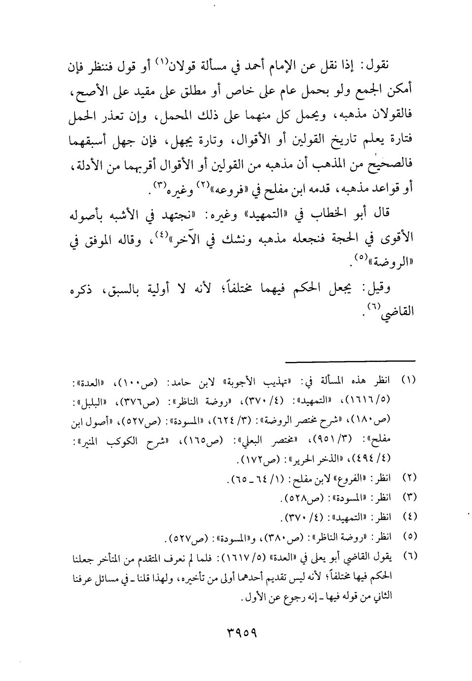 نقُول: إِذا نقل عَن الإِمَام أَحْمد فِي مَسْأَلَة قَولَانِ أَو قَول فَنَنْظُر فَإِن أمكن الْجمع وَلَو بِحمْل عَام على خَاص أَو مُطلق على مُقَيّد على الْأَصَح، فالقولان مذْهبه، وَيحمل كل مِنْهُمَا على ذَلِك الْمحمل، وَإِن تعذر الْحمل فَتَارَة يعلم تَارِيخ الْقَوْلَيْنِ أَو الْأَقْوَال، وَتارَة يجهل، فَإِن جهل أسبقهما فَالصَّحِيح من الْمَذْهَب أَن مذْهبه من الْقَوْلَيْنِ أَو الْأَقْوَال أقربهما من الْأَدِلَّة، أَو قَوَاعِد مذْهبه، قدمه ابْن مُفْلِح فِي " فروعه " وَغَيره.