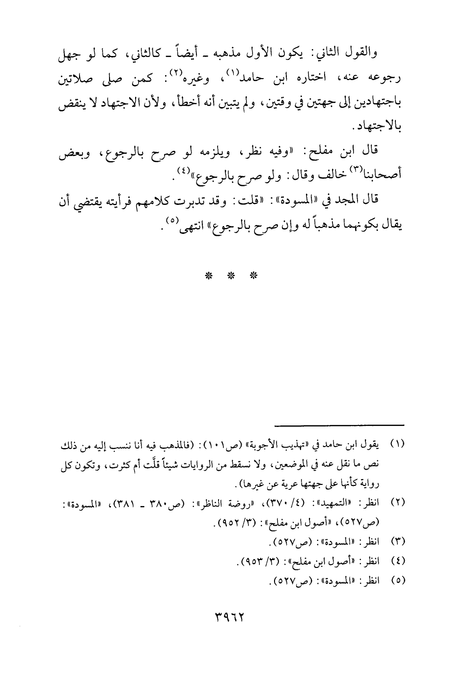 قَالَ الْمجد فِي " المسودة ": " قلت: وَقد تدبرت كَلَامهم فرأيته يَقْتَضِي أَن يُقَال بكونهما مذهبا لَهُ وَإِن صرح بِالرُّجُوعِ " انْتهى.
