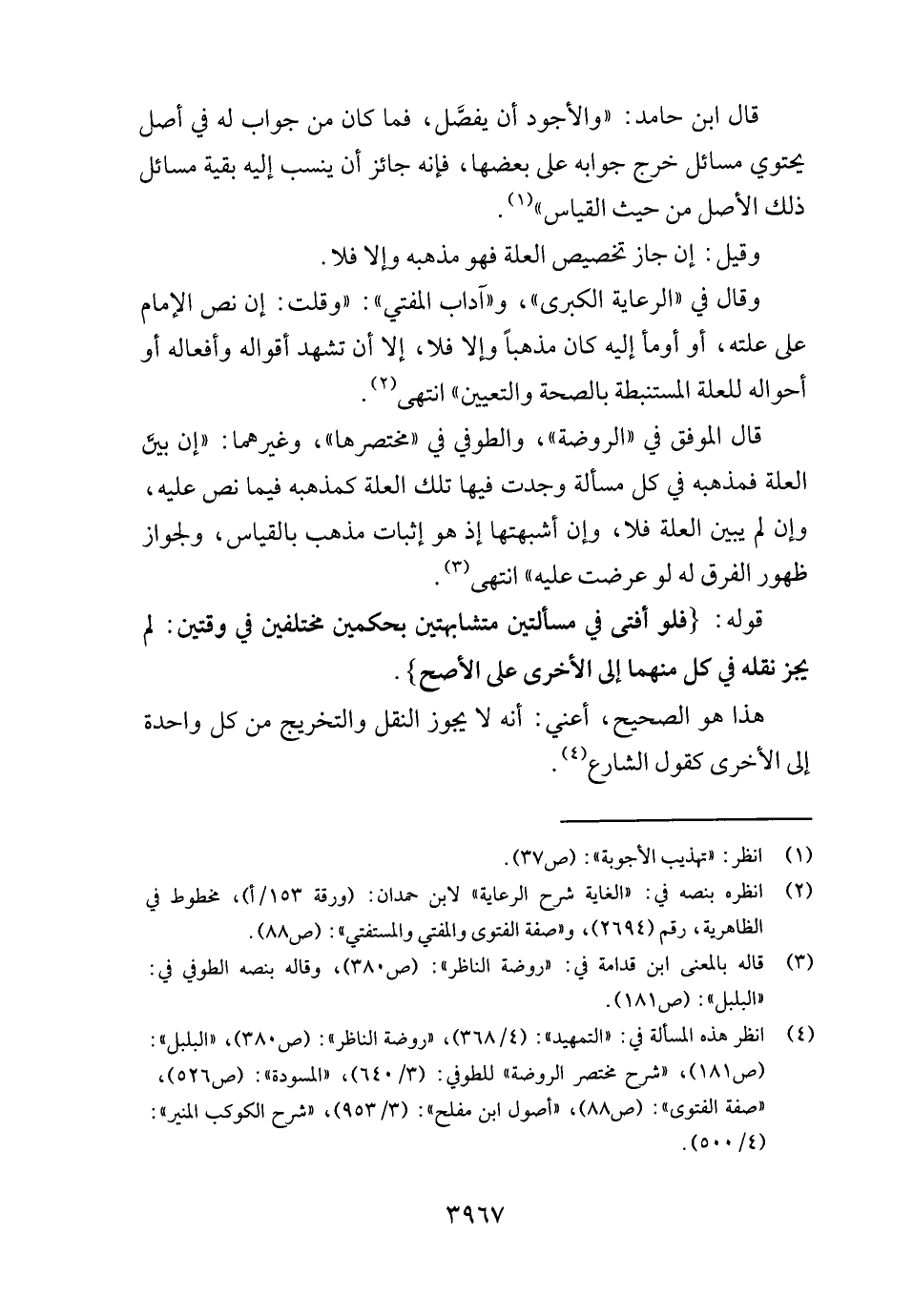 وَقَالَ فِي " الرِّعَايَة الْكُبْرَى "، و " آدَاب الْمُفْتِي ": " وَقلت: إِن نَص الإِمَام على علته، أَو أَوْمَأ إِلَيْهِ كَانَ مذهبا وَإِلَّا فَلَا، إِلَّا أَن تشهد أَقْوَاله وأفعاله أَو أَحْوَاله لِلْعِلَّةِ المستنبطة بِالصِّحَّةِ وَالتَّعْيِين " انْتهى.
