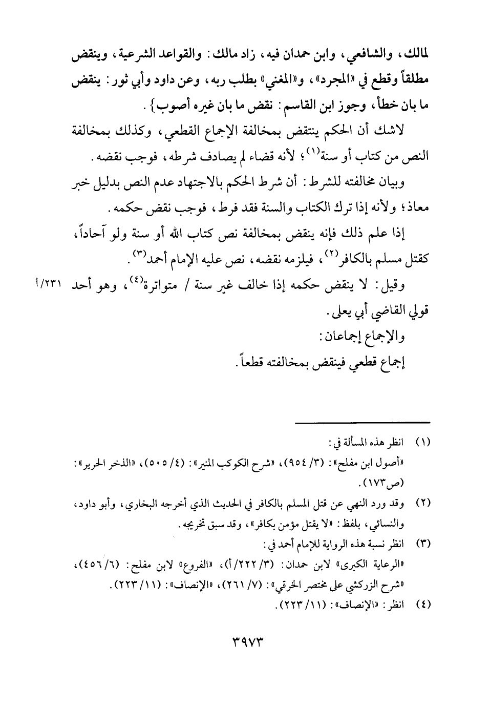 إِذا علم ذَلِك فَإِنَّهُ ينْقض بمخالفة نَص كتاب الله أَو سنة وَلَو آحادا، كَقَتل مُسلم بالكافر، فَيلْزمهُ نقضه، نَص عَلَيْهِ الإِمَام أَحْمد.