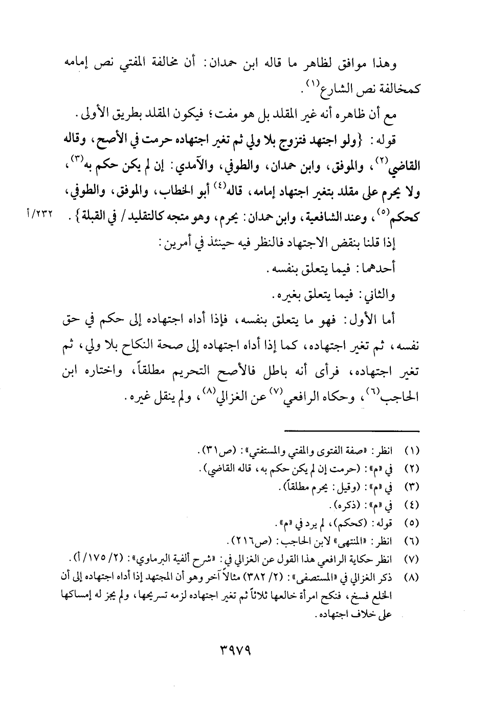 أما الأول: فَهُوَ مَا يتَعَلَّق بِنَفسِهِ، فَإِذا أَدَّاهُ اجْتِهَاده إِلَى حكم فِي حق نَفسه، ثمَّ تغير اجْتِهَاده، كَمَا إِذا أَدَّاهُ اجْتِهَاده إِلَى صِحَة النِّكَاح بِلَا ولي، ثمَّ تغير اجْتِهَاده، فَرَأى أَنه بَاطِل فَالْأَصَحّ التَّحْرِيم مُطلقًا، وَاخْتَارَهُ ابْن الْحَاجِب، وَحَكَاهُ الرَّافِعِيّ عَن الْغَزالِيّ، وَلم ينْقل غَيره.