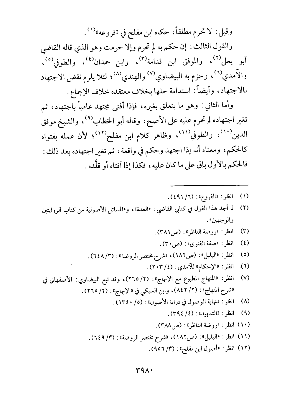 وَالْقَوْل الثَّالِث: إِن حكم بِهِ لم تحرم وَإِلَّا حرمت وَهُوَ الَّذِي قَالَه القَاضِي أَبُو يعلى، والموفق ابْن قدامَة، وَابْن حمدَان، والطوفي، والآمدي، وَجزم بِهِ الْبَيْضَاوِيّ والهندي؛ لِئَلَّا يلْزم نقض الِاجْتِهَاد بِالِاجْتِهَادِ، وَأَيْضًا: اسْتِدَامَة حلهَا بِخِلَاف معتقده خلاف الْإِجْمَاع.