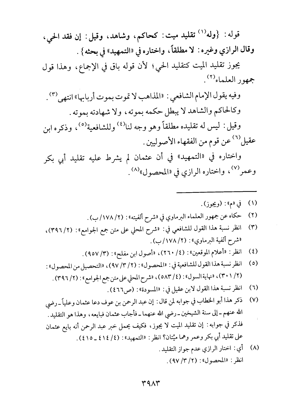 وَاخْتَارَهُ فِي " التَّمْهِيد " فِي أَن عُثْمَان لم يشرط عَلَيْهِ تَقْلِيد أبي بكر وَعمر، وَاخْتَارَهُ الرَّازِيّ فِي " الْمَحْصُول ".