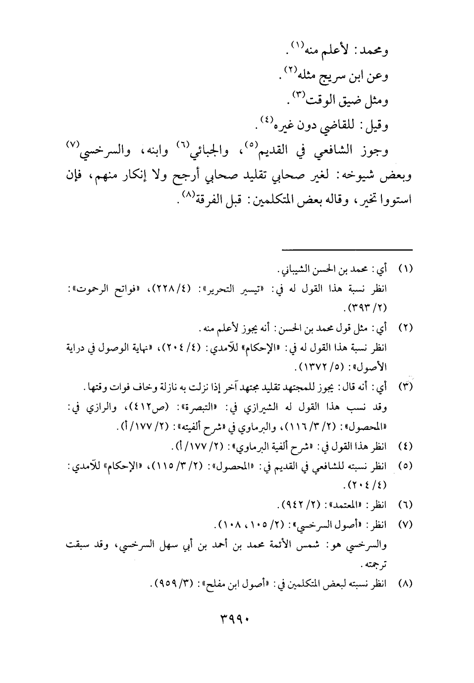 وَجوز الشَّافِعِي فِي الْقَدِيم، والجبائي وَابْنه، والسرخسي وَبَعض شُيُوخه: لغير صَحَابِيّ تَقْلِيد صَحَابِيّ أرجح وَلَا إِنْكَار مِنْهُم، فَإِن اسْتَووا تخير، وَقَالَهُ بعض الْمُتَكَلِّمين: قبل الْفرْقَة.