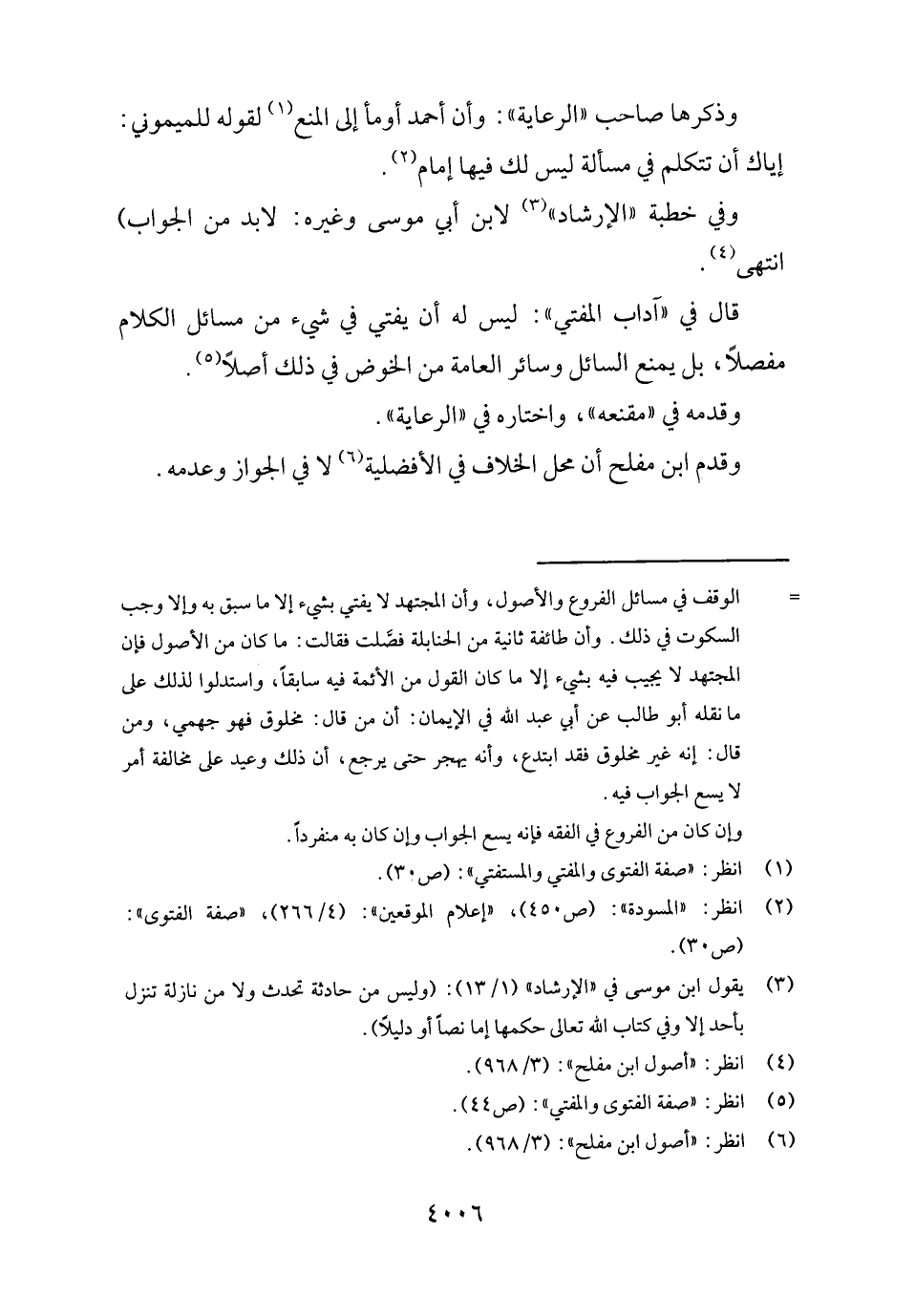 وَذكرهَا صَاحب " الرِّعَايَة ": وَأَن أَحْمد أَوْمَأ إِلَى الْمَنْع لقَوْله للميموني: إياك أَن تَتَكَلَّم فِي مَسْأَلَة لَيْسَ لَك فِيهَا إِمَام.