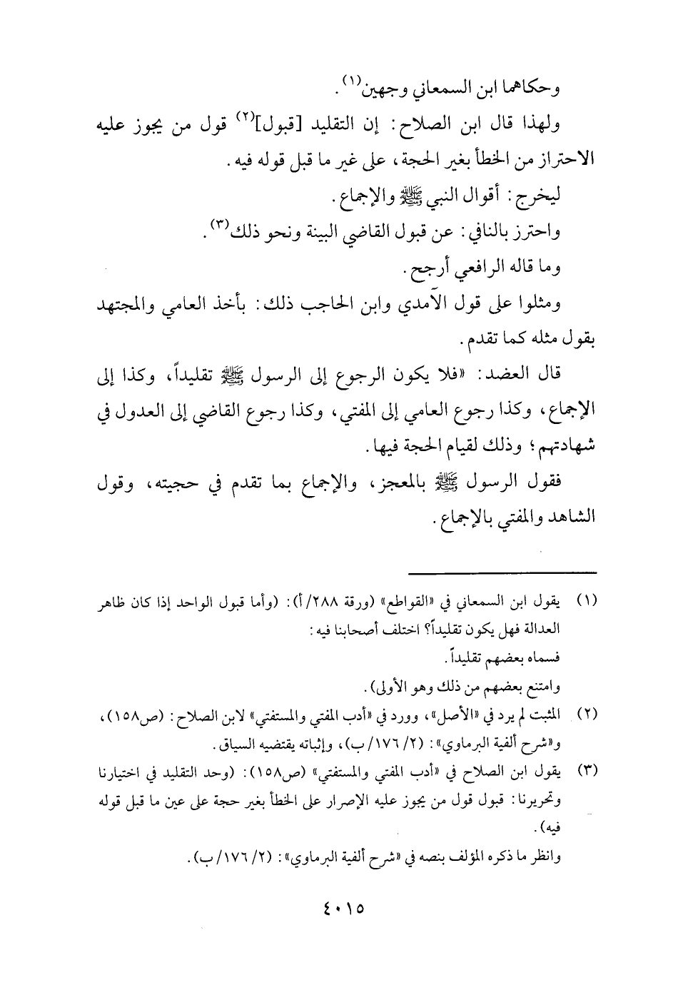وَلِهَذَا قَالَ ابْن الصّلاح: إِن التَّقْلِيد [قبُول] قَول من يجوز عَلَيْهِ الِاحْتِرَاز من الْخَطَأ بِغَيْر الْحجَّة، على غير مَا قبل قَوْله فِيهِ.
