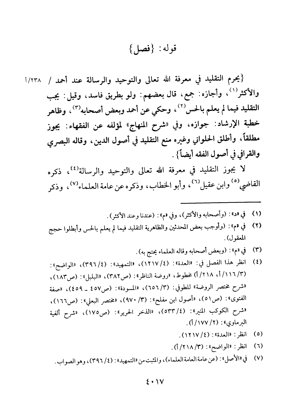 {يحرم التَّقْلِيد فِي معرفَة الله تَعَالَى والتوحيد والرسالة عِنْد أَحْمد وَالْأَكْثَر، وَأَجَازَهُ: جمع، قَالَ بَعضهم: وَلَو بطرِيق فَاسد، وَقيل: يجب التَّقْلِيد فِيمَا لم يعلم بالحس، وَحكي عَن أَحْمد وَبَعض أَصْحَابه، وَظَاهر خطْبَة الْإِرْشَاد: جَوَازه، وَفِي " شرح الْمِنْهَاج " لمؤلفه عَن الْفُقَهَاء: يجوز مُطلقًا، وَأطلق الْحلْوانِي وَغَيره منع التَّقْلِيد فِي أصُول الدّين، وَقَالَهُ الْبَصْرِيّ والقرافي فِي أصُول الْفِقْه أَيْضا} .