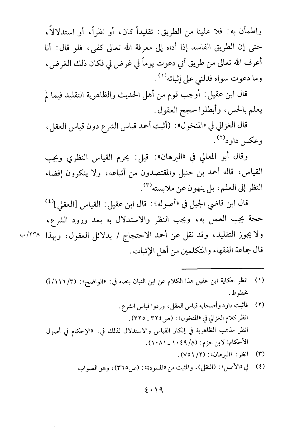 قَالَ ابْن عقيل: أوجب قوم من أهل الحَدِيث والظاهرية التَّقْلِيد فِيمَا لم يعلم بالحس، وأبطلوا حجج الْعُقُول.