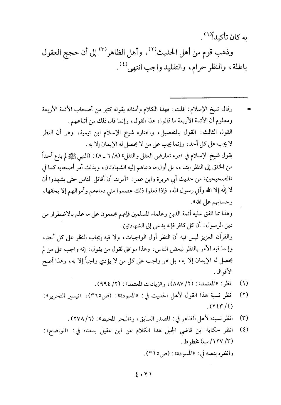 وَذهب قوم من أهل الحَدِيث، وَأهل الظَّاهِر إِلَى أَن حجج الْعُقُول بَاطِلَة، وَالنَّظَر حرَام، والتقليد وَاجِب انْتهى.