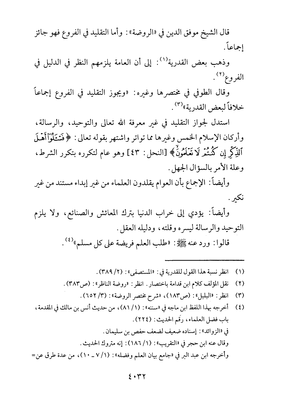 اسْتدلَّ لجَوَاز التَّقْلِيد فِي غير معرفَة الله تَعَالَى والتوحيد، والرسالة، وأركان الْإِسْلَام الْخمس وَغَيرهَا مِمَّا تَوَاتر واشتهر بقوله تَعَالَى: {فسئلوا أهل الذّكر إِن كُنْتُم لَا تعلمُونَ} [النَّحْل: ٤٣] وَهُوَ عَام لتكرره بِتَكَرُّر الشَّرْط، وَعلة الْأَمر بالسؤال الْجَهْل.