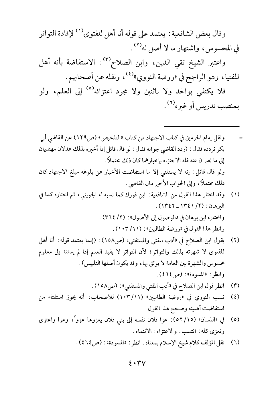 وَقَالَ بعض الشَّافِعِيَّة: يعْتَمد على قَوْله أَنا أهل للْفَتْوَى لإِفَادَة التَّوَاتُر فِي المحسوس، واشتهار مَا لَا أصل لَهُ.