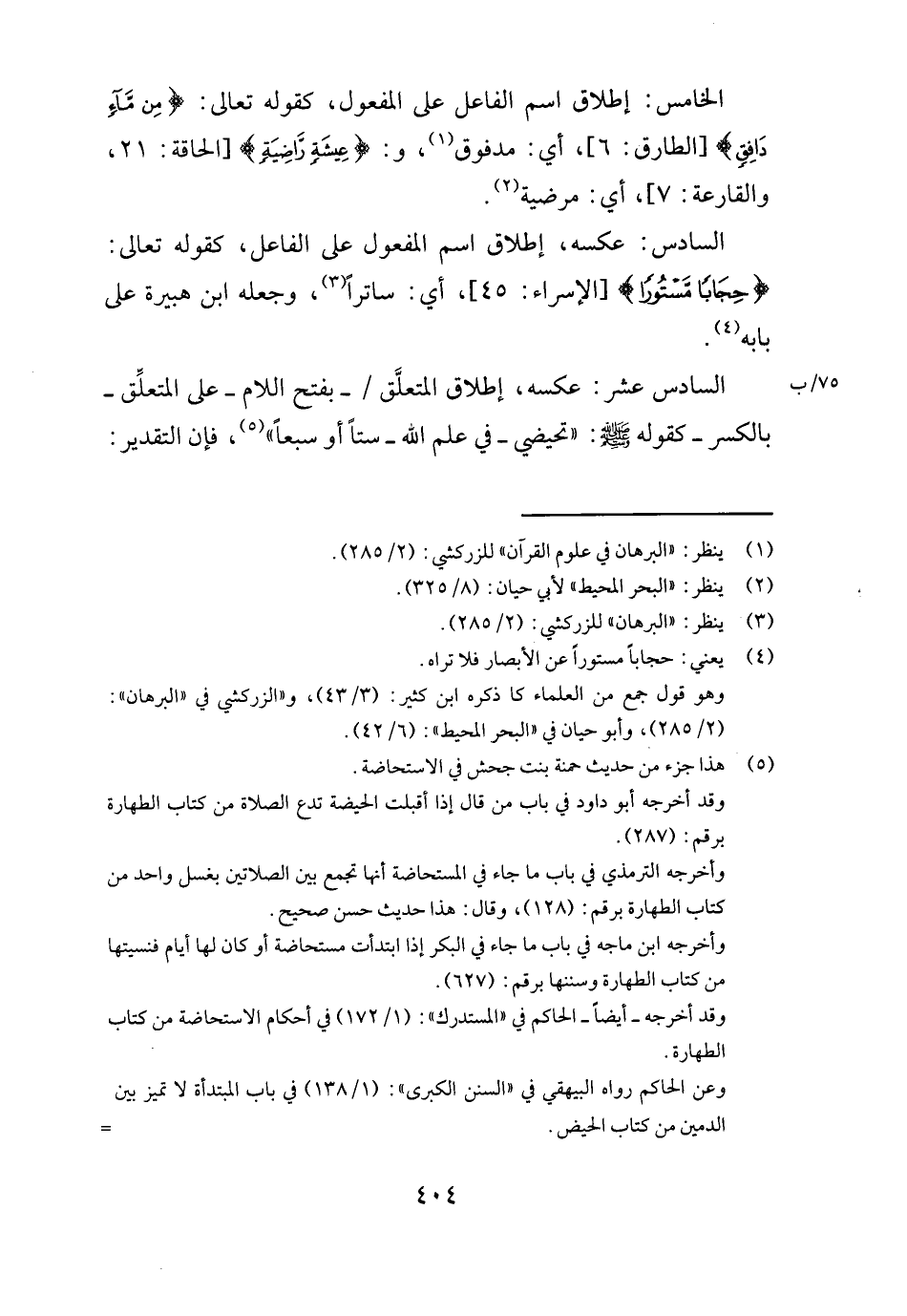 السَّادِس: عَكسه، إِطْلَاق اسْم الْمَفْعُول على الْفَاعِل، كَقَوْلِه تَعَالَى: {حِجَابا مَسْتُورا} [الْإِسْرَاء: ٤٥] ، أَي: ساتراً، وَجعله ابْن هُبَيْرَة على بَابه.