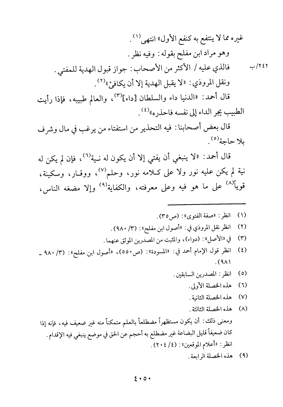 قَالَ أَحْمد: " لَا يَنْبَغِي أَن يُفْتِي إِلَّا أَن يكون لَهُ نِيَّة، فَإِن لم يكن لَهُ نِيَّة لم يكن عَلَيْهِ نور وَلَا على كَلَامه نور، وحلم، ووقار، وسكينة، قَوِيا على مَا هُوَ فِيهِ وعَلى مَعْرفَته، والكفاية وَإِلَّا مضغه النَّاس،