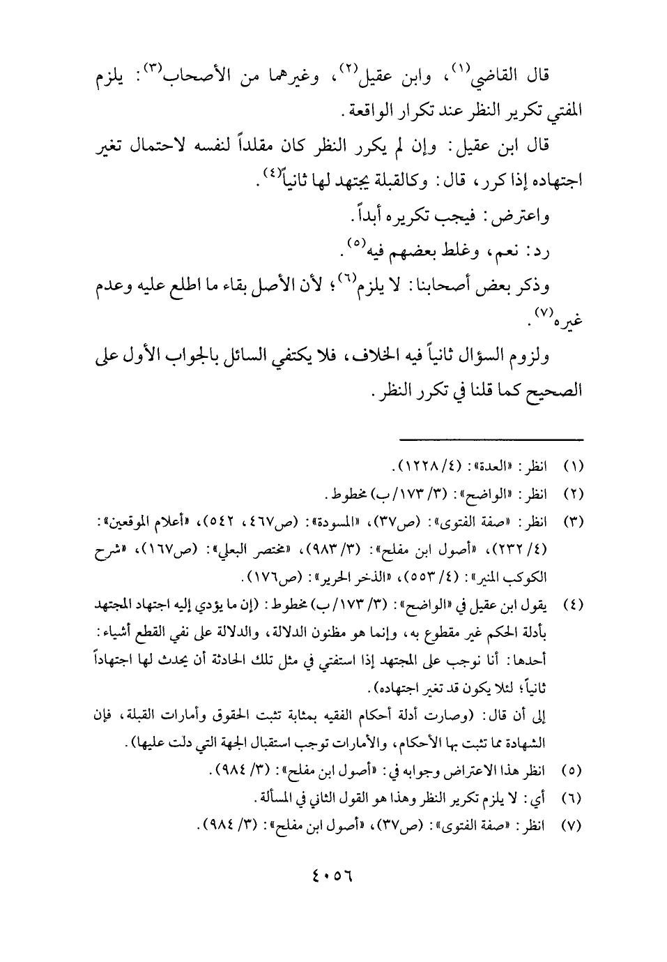 قَالَ القَاضِي، وَابْن عقيل، وَغَيرهمَا من الْأَصْحَاب: يلْزم الْمُفْتِي تَكْرِير النّظر عِنْد تكْرَار الْوَاقِعَة.