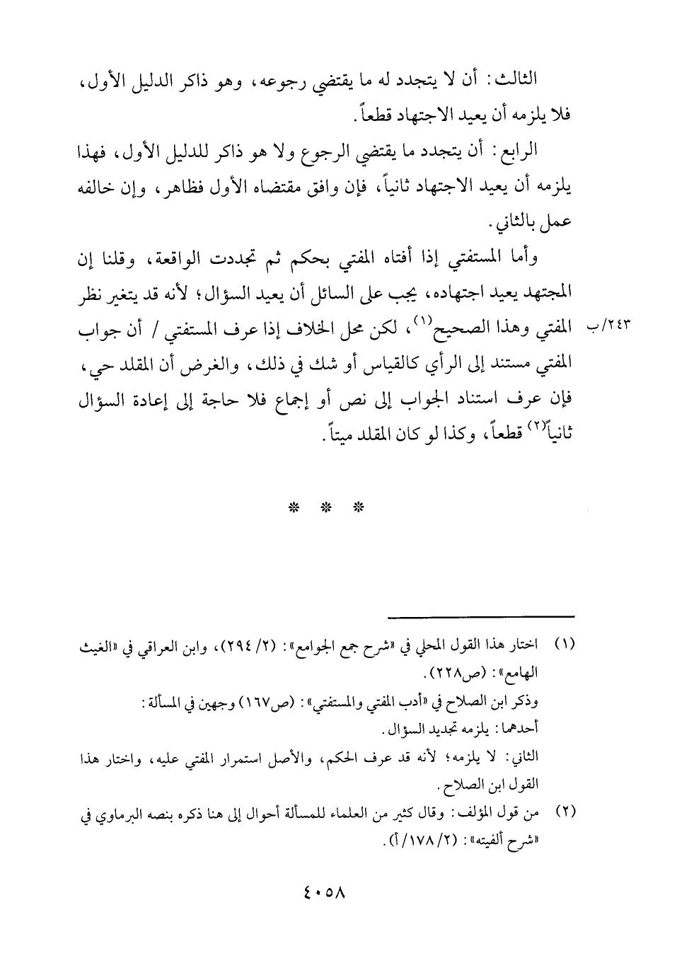 الثَّالِث: أَن لَا يَتَجَدَّد لَهُ مَا يَقْتَضِي رُجُوعه، وَهُوَ ذَاكر الدَّلِيل الأول، فَلَا يلْزمه أَن يُعِيد الِاجْتِهَاد قطعا.
