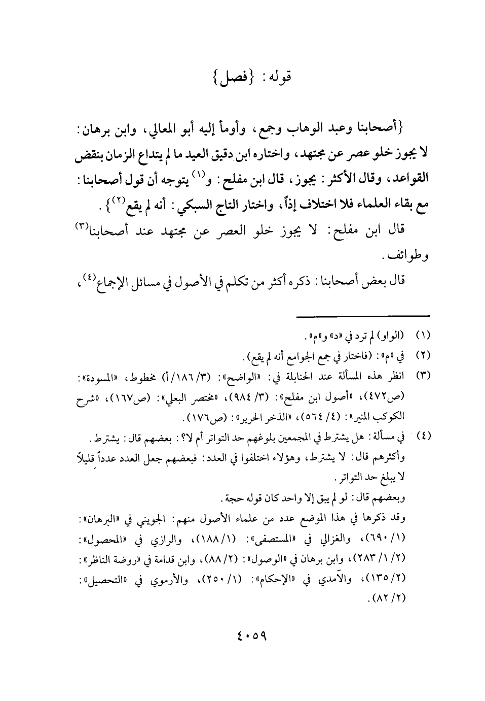{أَصْحَابنَا وَعبد الْوَهَّاب وَجمع، وَأَوْمَأَ إِلَيْهِ أَبُو الْمَعَالِي، وَابْن برهَان: لَا يجوز خلو عصر عَن مُجْتَهد، وَاخْتَارَهُ ابْن دَقِيق الْعِيد مَا لم يتداع الزَّمَان بِنَقْض الْقَوَاعِد، وَقَالَ الْأَكْثَر: يجوز، قَالَ ابْن مُفْلِح: وَيتَوَجَّهُ أَن قَول أَصْحَابنَا: مَعَ بَقَاء الْعلمَاء فَلَا اخْتِلَاف إِذا، وَاخْتَارَ التَّاج السُّبْكِيّ: أَنه لم يَقع} .
