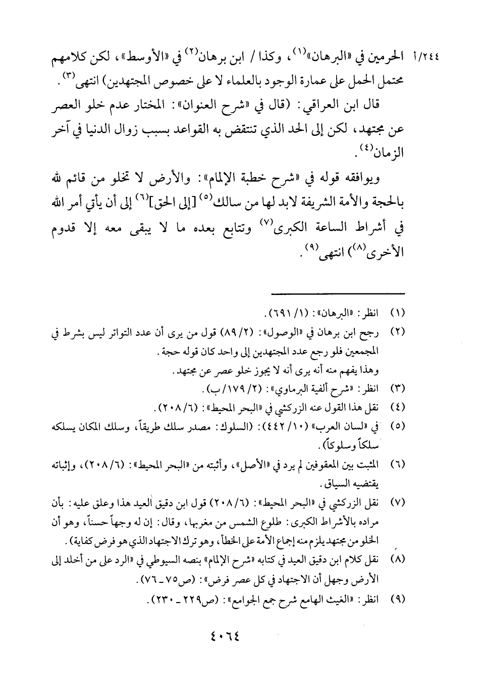 الْحَرَمَيْنِ فِي " الْبُرْهَان "، وَكَذَا ابْن برهَان فِي " الْأَوْسَط "، لَكِن كَلَامهم مُحْتَمل الْحمل على عمَارَة الْوُجُود بالعلماء لَا على خُصُوص الْمُجْتَهدين) انْتهى.